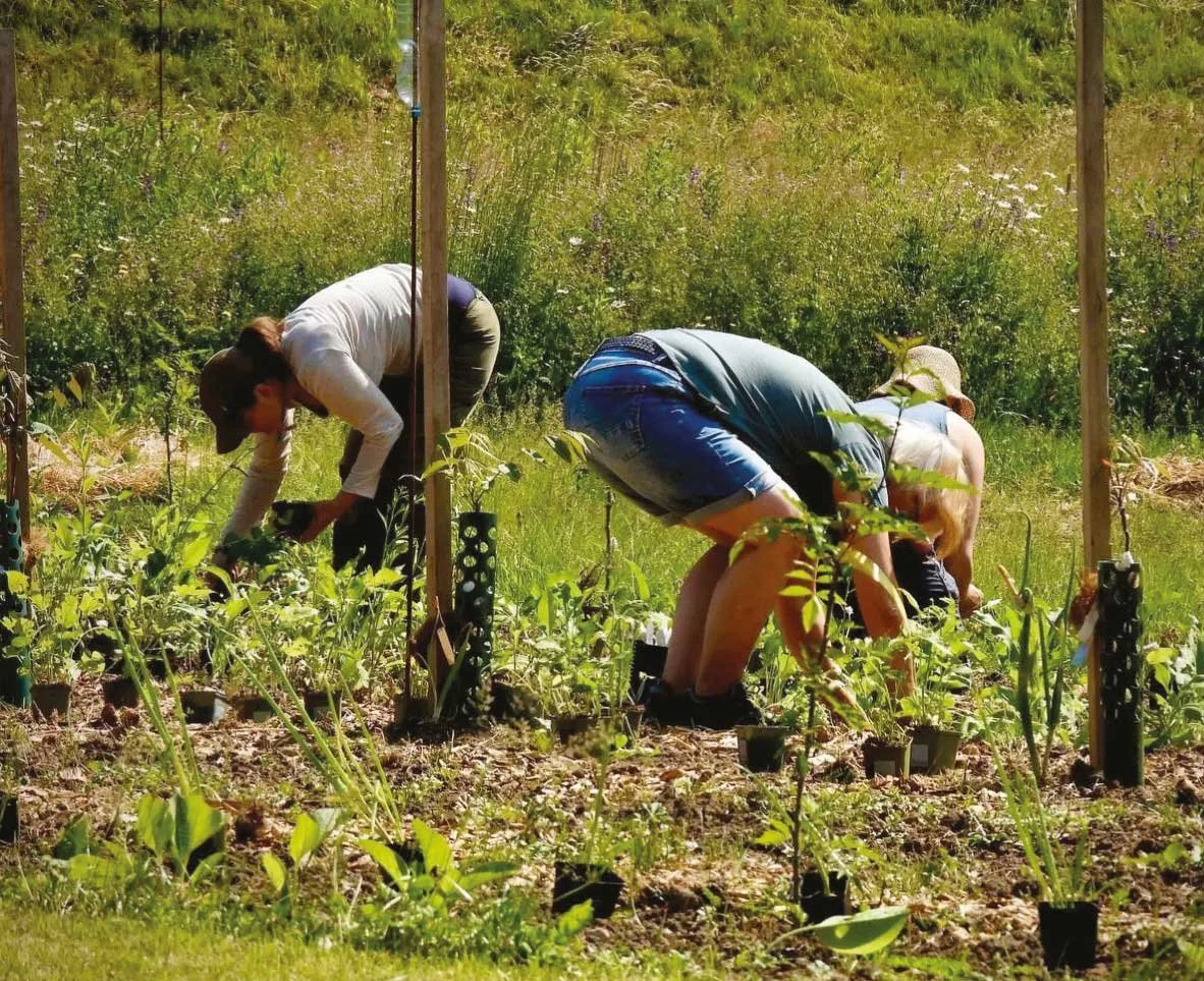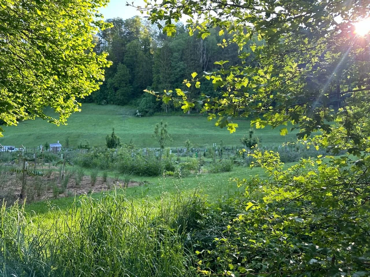Der Waldgarten beim Camping Saland wurde als eigenständiges, strukturiertes und mehrschichtiges Pflanzsystem geplant und schrittweise realisiert. Er orientiert sich an den Funktionsprinzipien natürlicher Waldökosysteme und überführt diese in einen gestalteten und kultivierten Waldgarten.