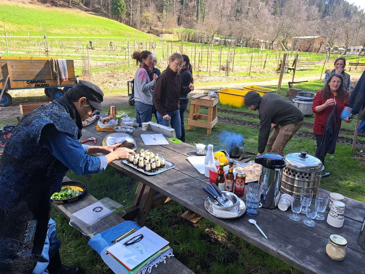 Der Waldgarten verbindet damit Produktion und unmittelbaren Konsum in räumlicher Nähe. Die Erzeugnisse aus dem Waldgarten sind ein ergänzender Bestandteil seiner Küche. Als japanischer Koch fermentiert und kocht er mit Arten und Sorten, die er aus seiner Heimat kennt, und integriert diese in seine Zubereitungen. Masaki Tega bietet zweimal pro Woche Mahlzeiten an; Informationen dazu sind über den Campingplatz erhältlich.