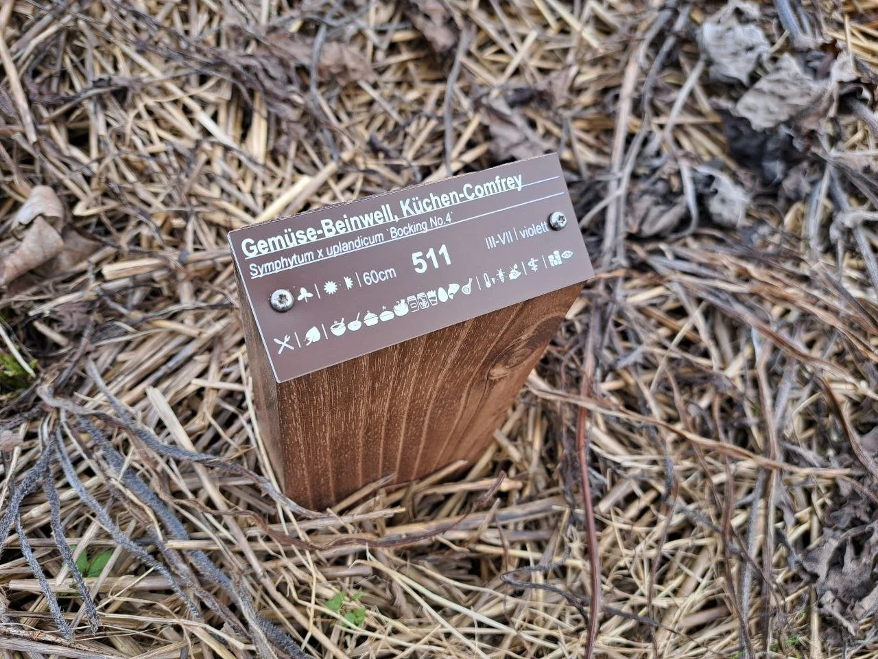 Zur Abgrenzung gegenüber den Wiesenwegen und zur Verringerung des Pflegeaufwands wurden die dauerhaften Pflanzflächen gezielt mit Gemüse-Beinwell (Symphytum x uplandicum Bocking Nr.4) eingefasst, der innerhalb von zwei Jahren eine dichte Wurzelbarriere ausbildet. Auch Medizinal-Salbei (Salvia officinalis) hat sich als begrenzende Pflanzung bewährt. Zu Beginn des Projektes haben wir einige Bereiche mit der Beinwell-Sorte Bocking Nr.14 bepflanzt, was sich jedoch als Fehler herausgestellt hat, da diese Sorte nicht so wüchsig sich verhält wie Bocking Nr.4. Genauere Hintergründe zu dem Thema Beinwell werden noch in einem künftigen Blog verfasst.